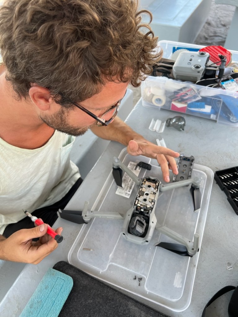 Was ich noch gar nicht erzählt habe, dass es schon wieder einen Drohnenabsturz gab und zwar bereits in der Skeleton Coast. Grund des Absturzes laut Burchpilot Adam „das Gelände habe sich plötzlich erhoben“ und da er im Sportmodus ohne Sensoren geflogen ist, gab es keine Warnung. Sie stürzte in den Sandboden. Es rieselte aus allen Ecken Sand. Eine Grobreinigung mit Brillenputztuch und Kompressor ergab weiter Flugunfähigkeit. Er wollte sie aber noch nicht aufgeben und so wurde das Feinmechaniker-Werkzeug und WD40 ausgepackt.