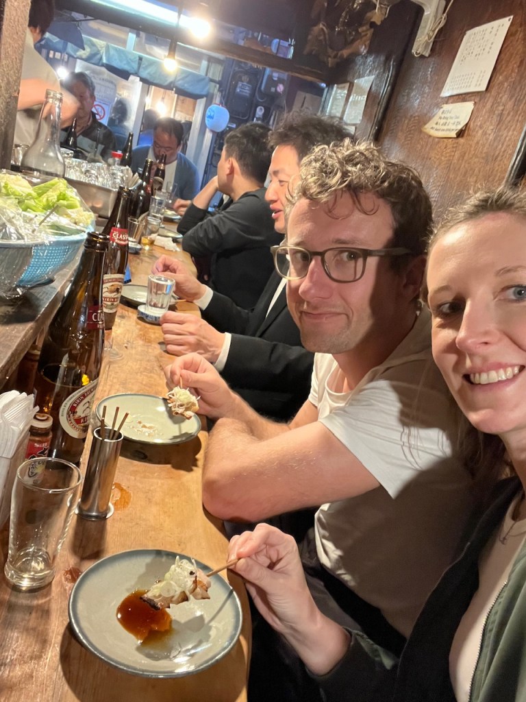 Wir legten 16km zu Fuß zurück und da musste noch ein Snack her – die Omoide Yokocho Food Street in Shinjuku. Erst waren wir etwas verunsichert durch die vielen Touristen die filmend durch die kleine Gasse an den kleinen „Restaurants“ vorbeiliefen. Doch es trauten sich nur die wenigstens auch hier Platz zu nehmen. Also ging es für uns in die kleinste, ohne englische Beschriftung, Cash only Ecke, die wir finden konnten. Wir wurden zwischen zwei Lokals gesetzt und bestellten zwei Bier (durch zeigen auf das Nachbarbier) und bei Zeigen auf den Grill signalisierten wir „all in“ – wir wussten weder was wir bekamen, noch wieviel, noch den Preis.