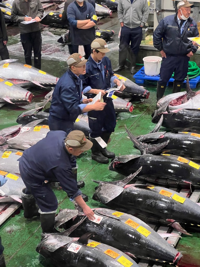 Doch wir mussten einen höflichen Absprung schaffen, da unser Wecker am nächsten Tag auf 4:40 Uhr stand. Wir hatten nämlich die Thunfisch-Lottery im Toyosu Markt (wohl größtem Fischmarkt der Welt) gewonnen. Ich glaube, dass ich kurz diese Lotterie erklären muss, denn „nein, wir haben leider keinen Bluefin Tuna gewonnen“. Immer am 1. des Vormonats wird um Mitternacht (japanischer Zeit) die Lotterie für die auf 100 Zuschauer begrenzten Tickets für die Thunfischauktion gestartet. Natürlich hatte ich eine Erinnerung dafür im Handy und wir hatten Glück und haben zwei Tickets gewonnen. Die Fischauktion findet 5:30 Uhr statt, aber es hat sich gelohnt.