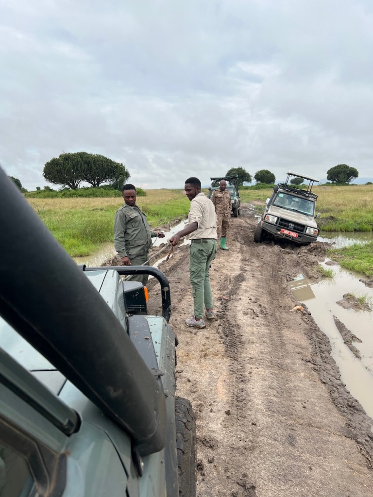 Vor uns setzten sich noch zwei weitere Safari-Autos in den Graben. Alle danach fuhren langsam rückwärts und drehten. Was nun? Unser Ehrgeiz war gepackt, dass wir es allein (also zusammen als Team) schaffen wollten. Tony draußen, zeitweise auf der Suche nach den MaxTracks, weil sie so im Schlamm vergraben waren und am Schlamm schaufeln. Ich auf dem Fahrersitz mit allen Sperren und Untersetzung ohne Gas nur an der Kupplung spielend.