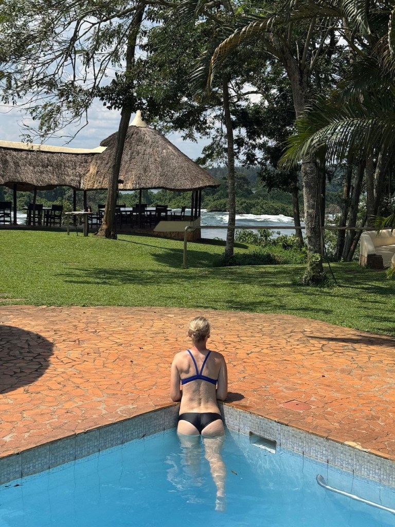 Es ging knapp 20km den Nil flussabwärts. Zurück auf der Campsite verbrachten wir den Nachmittag mit Routenplanung (also was wir am nächsten Tag machen wollen) am Pool und konnten von hier auch die Stromschnelle (in einer Karte sogar als Wasserfall bezeichnet) beobachten.