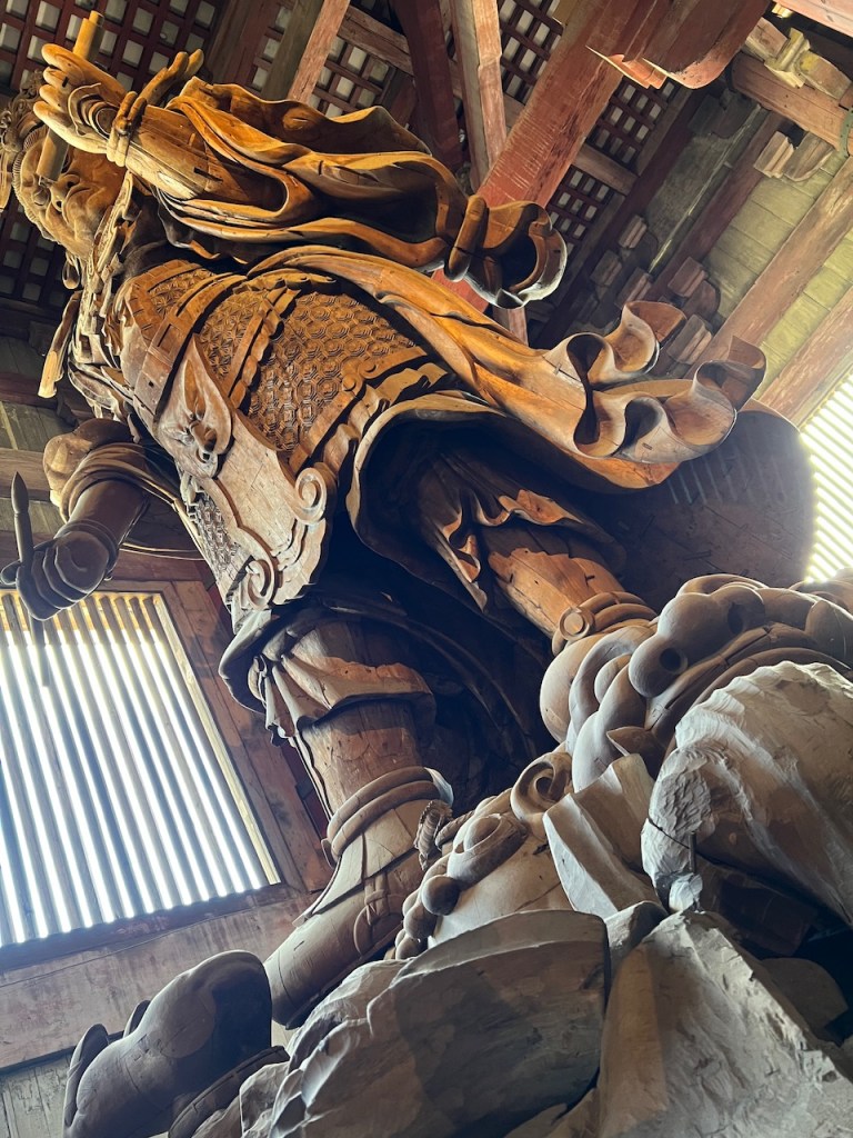 Zum Schutz steht der Buddha im größten Holzgebäude der Welt und wird von meterhohen Wächtern beschützt, der eine steht sogar auf einem erschlagenen „Monster“.